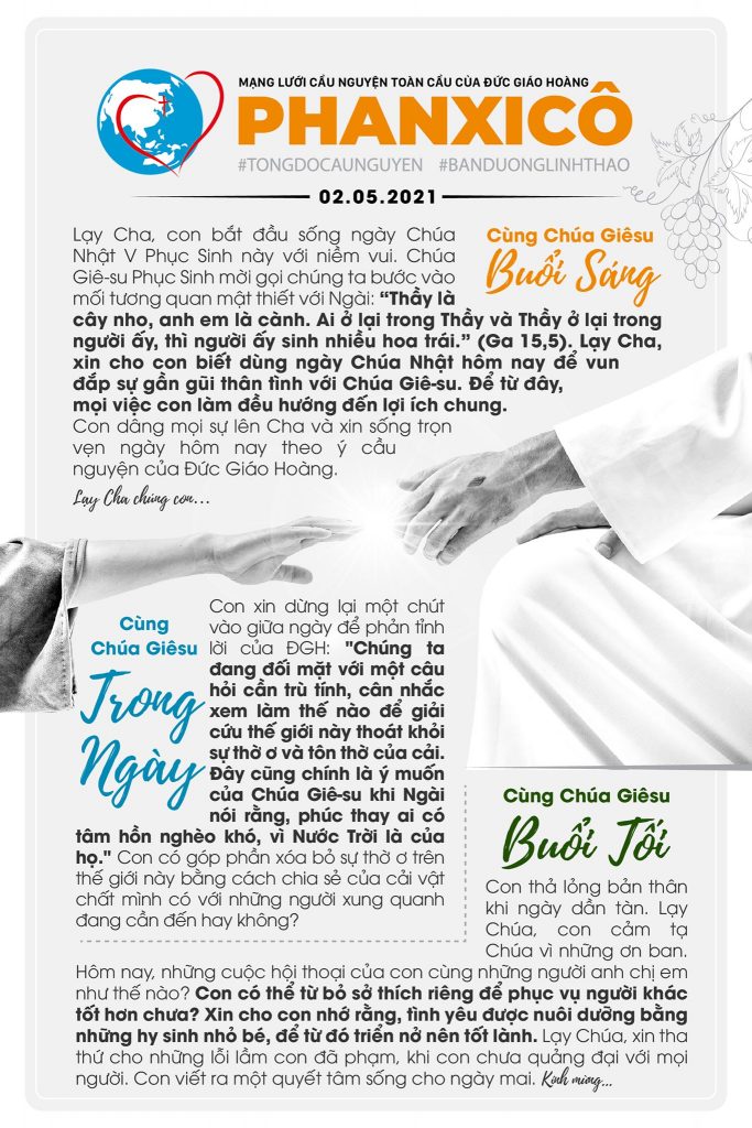 Lạy Cha, con bắt đầu sống ngày Chúa Nhật V Phục Sinh này với niềm vui. Chúa Giê-su Phục Sinh mời gọi chúng ta bước vào mối tương quan mật thiết với Ngài: “Thầy là cây nho, anh em là cành. Ai ở lại trong Thầy và Thầy ở lại trong người ấy, thì người ấy sinh nhiều hoa trái.” (Ga 15,5). Lạy Cha, xin cho con biết dùng ngày Chúa Nhật hôm nay để vun đắp sự gần gũi thân tình với Chúa Giê-su. Để từ đây, mọi việc con làm đều hướng đến lợi ích chung. Con dâng mọi sự lên Cha và xin sống trọn vẹn ngày hôm nay theo ý cầu nguyện của Đức Giáo Hoàng. Lạy Cha chúng con…