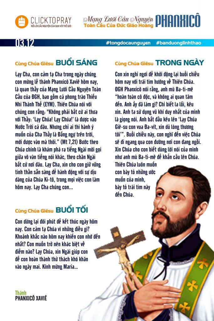 Lạy Cha, con cảm tạ Cha trong ngày chúng con mừng lễ thánh Phanxicô Xaviê hôm nay, là quan thầy của Mạng Lưới Cầu Nguyện Toàn Cầu của ĐGH, bao gồm cả phong trào Thiếu Nhi Thánh Thể (EYM). Thiên Chúa nói với chúng con rằng: “Không phải bất cứ ai thưa với Thầy: ‘Lạy Chúa! Lạy Chúa!’ là được vào Nước Trời cả đâu. Nhưng chỉ ai thi hành ý muốn của Cha Thầy là Đấng ngự trên trời, mới được vào mà thôi.” (Mt 7,21) Bước theo Chúa chính là khám phá ra tiếng Ngài mời gọi giữa vô vàn tiếng nói khác, theo chân Ngài bất cứ nơi đâu. Lạy Cha, xin cho con giữ vững tinh thần sẵn sàng để hành động với sự dịu dàng của Chúa Ki-tô, trong mọi việc con làm hôm nay. Lạy Cha chúng con…