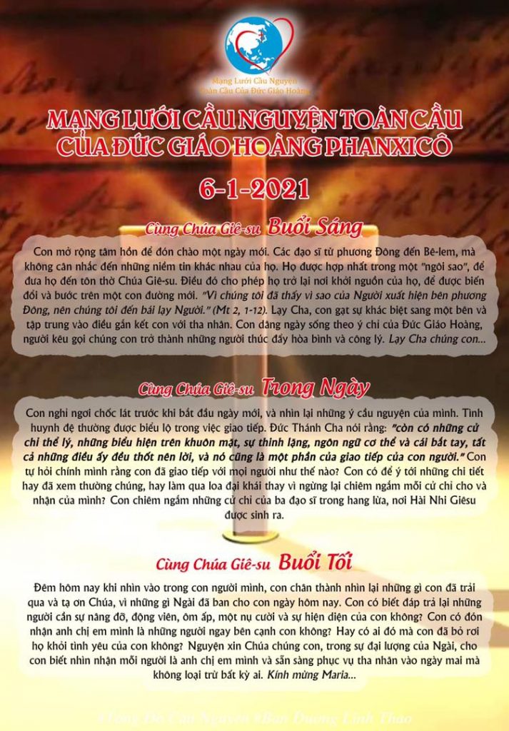 Con mở rộng tâm hồn để đón chào một ngày mới. Các đạo sĩ từ phương Đông đến Bê-lem, mà không cân nhắc đến những niềm tin khác nhau của họ. Họ được hợp nhất trong một “ngôi sao”, để đưa họ đến tôn thờ Chúa Giê-su. Điều đó cho phép họ trở lại nơi khởi nguồn của họ, để được biến đổi và bước trên một con đường mới. “Vì chúng tôi đã thấy vì sao của Người xuất hiện bên phương Đông, nên chúng tôi đến bái lạy Người.” (Mt 2, 1-12). Lạy Cha, con gạt sự khác biệt sang một bên và tập trung vào điều gắn kết con với tha nhân. Con dâng ngày sống theo ý chỉ của Đức Giáo Hoàng, người kêu gọi chúng con trở thành những người thúc đẩy hòa bình và công lý. Lạy Cha chúng con…..