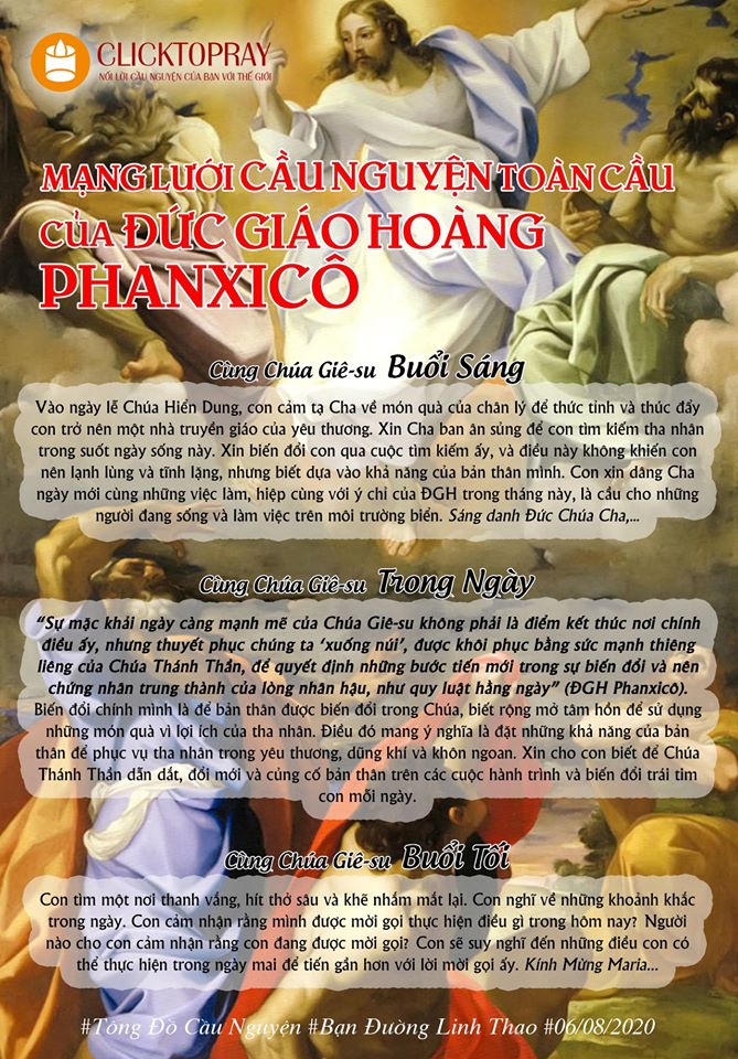 Vào ngày lễ Chúa Hiển Dung, con cảm tạ Cha về món quà của chân lý để thức tỉnh và thúc đẩy con trở nên một nhà truyền giáo của yêu thương. Xin Cha ban ân sủng để con tìm kiếm tha nhân trong suốt ngày sống này. Xin biến đổi con qua cuộc tìm kiếm ấy, và điều này không khiến con nên lạnh lùng và tĩnh lặng, nhưng biết dựa vào khả năng của bản thân mình. Con xin dâng Cha ngày mới cùng những việc làm, hiệp cùng với ý chỉ của ĐGH trong tháng này, là cầu cho những người đang sống và làm việc trên môi trường biển.