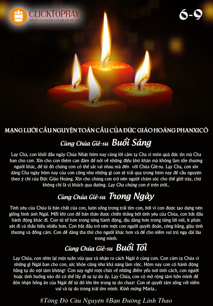 Lạy Cha, con khởi đầu ngày Chúa Nhật hôm nay cùng lời cảm tạ Cha vì món quà đức tin mà Cha ban cho con. Xin cho con thêm can đảm để nói về những điều khó khăn mà không làm tổn thương người khác, để từ đó chúng con có thể sát vai nhau mà đến với Chúa Giê-su. Lạy Cha, con xin dâng Cha ngày hôm nay của con cũng như những gì con sẽ trải qua trong hôm nay để cầu nguyện theo ý chỉ của Đức Giáo Hoàng. Xin cho chúng con trở nên người chăm sóc cho thế giới này, chứ không chỉ là vị khách qua đường.