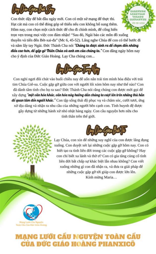 Con nghỉ ngơi đôi chút vào buổi chiều nay để uốn nắn trái tim mình hòa điệu với trái tim Chúa Giê-su. Cuộc gặp gỡ giữa con với người lối xóm hôm nay như thế nào? Con đã dành tâm tình cho họ ra sao? Đức Thánh Cha nói rằng chúng con được mời gọi để xây dựng “một văn hóa khác, văn hóa này hướng dẫn chúng ta vượt lên trên những thù hằn để quan tâm đến người khác.” Con tập sống thái độ phục vụ và chăm sóc, cười tươi, ứng xử dịu dàng và nhận ra nhu cầu của những người bên cạnh con. Tình huynh đệ được gầy dựng từ những hành xử nhỏ nhặt hàng ngày. Con cầu nguyện hơn nữa cho tình thân trên thế giới.