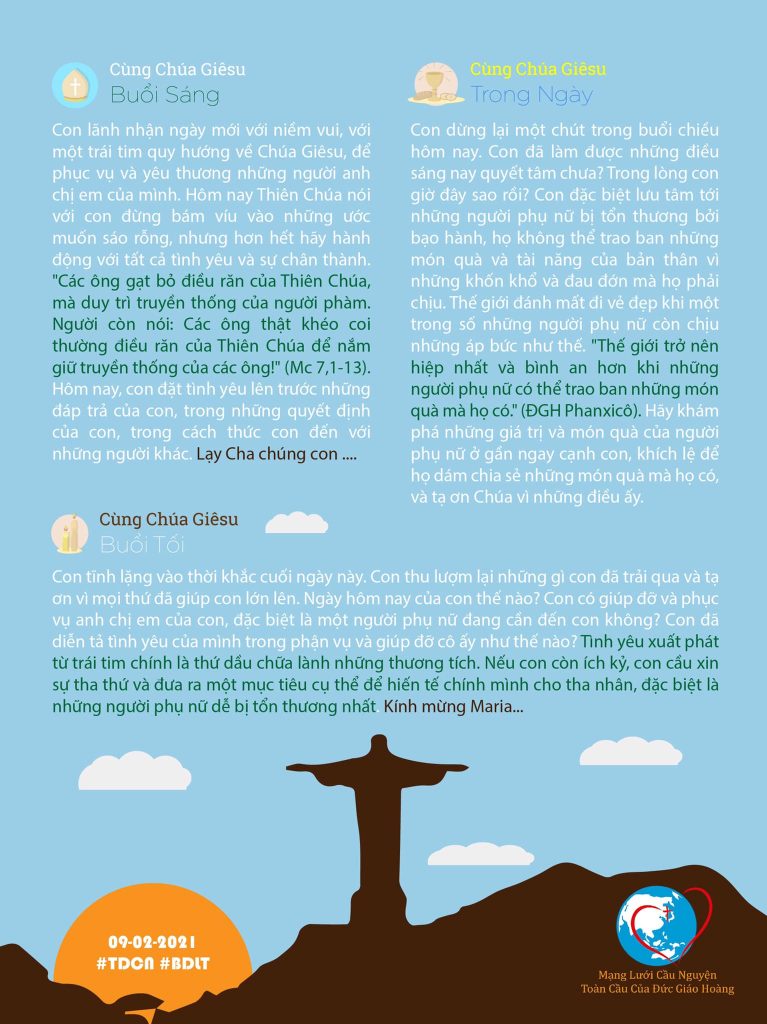 Con lãnh nhận ngày mới với niềm vui, với một trái tim quy hướng về Chúa Giêsu, để phục vụ và yêu thương những người anh chị em của mình. Hôm nay Thiên Chúa nói với con đừng bám víu vào những ước muốn sáo rỗng, nhưng hơn hết hãy hành động với tất cả tình yêu và sự chân thành. “Các ông gạt bỏ điều răn của Thiên Chúa, mà duy trì truyền thống của người phàm. Người còn nói: Các ông thật khéo coi thường điều răn của Thiên Chúa để nắm giữ truyền thống của các ông!” (Mc 7,1-13). Hôm nay, con đặt tình yêu lên trước những đáp trả của con, trong những quyết định của con, trong cách thức con đến với những người khác. Lạy Cha chúng con ….