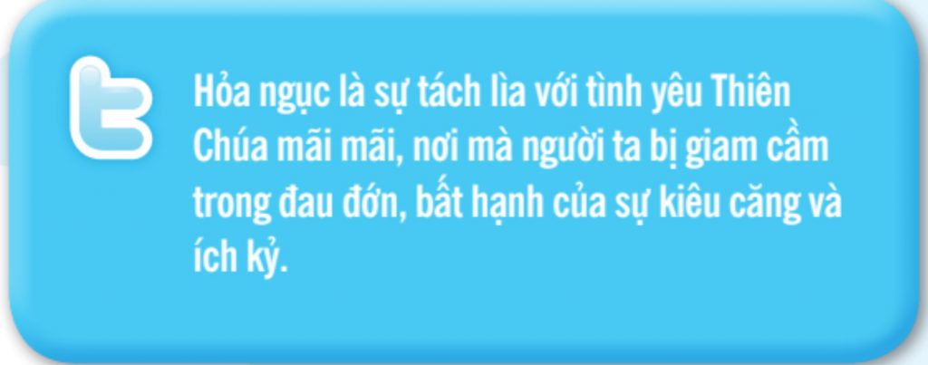 Hỏa ngục là nơi dành cho những người quyết định không yêu mến Thiên Chúa trong ý thức rõ ràng và dứt khoát. Chúng ta không biết hỏa ngục như thế nào. Chúng ta chỉ biết đó là sự xa lìa tình yêu Thiên Chúa mãi mãi. Đó là điều vô cùng kinh khủng, vì chỉ nơi Thiên Chúa ta tìm thấy sự sống, tình yêu, hạnh phúc là những điều mà chúng ta được tạo dựng nên để tận hưởng (GLHTCG 1057).
