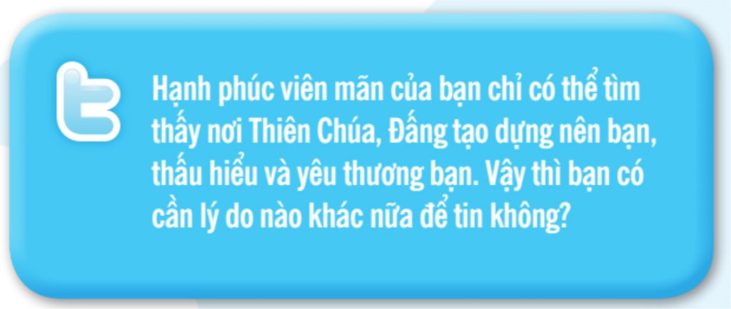 Dù bạn tin vào Ngài hay không thì Thiên Chúa vẫn yêu bạn. Chính Thiên Chúa, thông qua cha mẹ bạn, đã cho bạn sự sống. Và Thiên Chúa còn đi xa hơn thế. Chúa muốn cho bạn chính cuộc sống của Ngài qua Đức Giêsu (xem 1.26).Bạn cũng có thể sống với Thiên Chúa! Để điều đó thành sự, bạn chỉ cần chấp nhận kế hoạch Ngài dành cho bạn và hợp tác vào kế hoạch đó (xem 4.3). Mục đích của kế hoạch đó là làm cho bạn hạnh phúc, bây giờ và mãi mãi trên Thiên đàng(xem 1.45). Giống như cha mẹ yêu thương con cái mình, Thiên Chúa chỉ muốn những điều tốt nhất cho bạn (Rm 8, 14). Đức Giêsu dạy rằng ta có thể tự do thưa chuyện với Thiên Chúa như với người Cha của mình. Ngài hiểu mọi thứ và gửi Chúa Thánh Thần đến để giúp ta tin (xem 1.32).