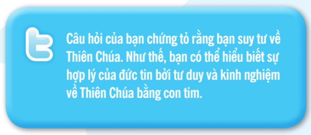 Đức Giáo Hoàng Bênêđictô XVI đã nói trong cuộc họp với các nhà báo về tầm quan trọng của việc “đưa ra những lý do cho đức tin” (26/11/2010). Những cuốn sách như Tweetings với Chúa có thể giúp bạn suy nghĩ về đức tin có ý nghĩa gì đối với bạn. Đồng thời, cũng rất quan trọng để nhận ra rằng còn có những điều quan trọng hơn như: sự thật căn bản là Thiên Chúa yêu thương chúng ta.