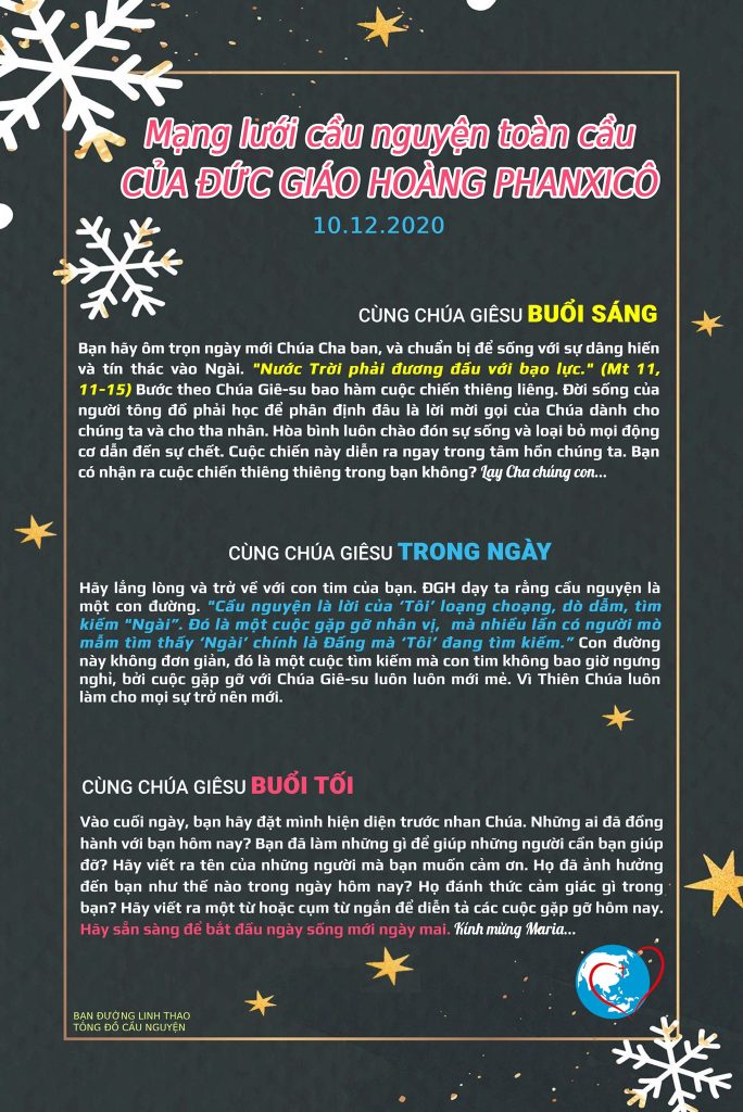 Bạn hãy ôm trọn ngày mới Chúa Cha ban, và chuẩn bị để sống với sự dâng hiến và tín thác vào Ngài. “Nước Trời phải đương đầu với bạo lực.” (Mt 11, 11-15) Bước theo Chúa Giê-su bao hàm cuộc chiến thiêng liêng. Đời sống của người tông đồ phải học để phân định đâu là lời mời gọi của Chúa dành cho chúng ta và cho tha nhân. Hòa bình luôn chào đón sự sống và loại bỏ mọi động cơ dẫn đến sự chết. Cuộc chiến này diễn ra ngay trong tâm hồn chúng ta. Bạn có nhận ra cuộc chiến thiêng thiêng trong bạn không? Lạy Cha chúng con…