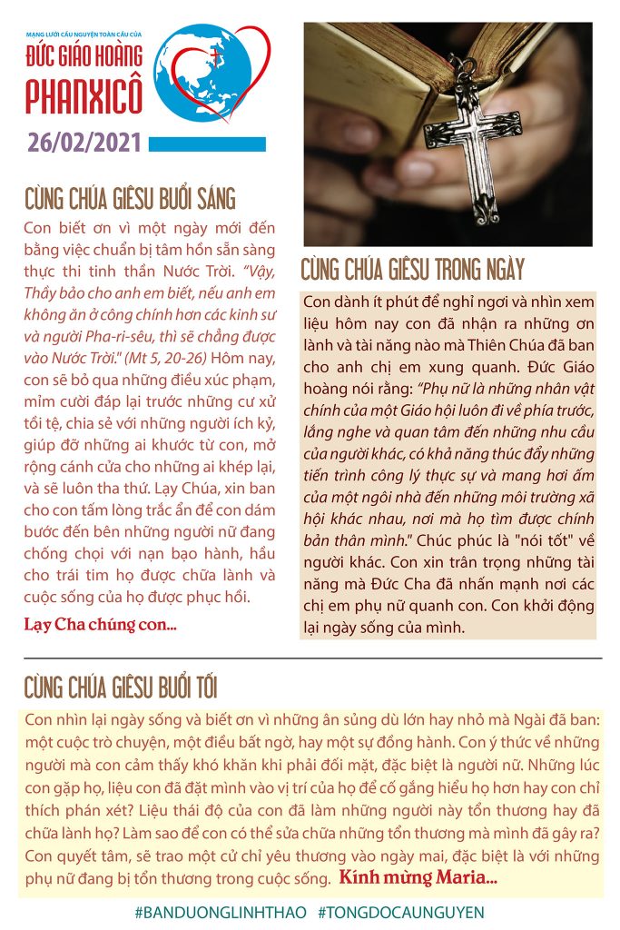 Con biết ơn vì một ngày mới đến bằng việc chuẩn bị tâm hồn sẵn sàng thực thi tinh thần Nước Trời. “Vậy, Thầy bảo cho anh em biết, nếu anh em không ăn ở công chính hơn các kinh sư và người Pha-ri-sêu, thì sẽ chẳng được vào Nước Trời.” (Mt 5, 20-26) Hôm nay, con sẽ bỏ qua những điều xúc phạm, mỉm cười đáp lại trước những cư xử tồi tệ, chia sẻ với những người ích kỷ, giúp đỡ những ai khước từ con, mở rộng cánh cửa cho những ai khép lại, và sẽ luôn tha thứ. Lạy Chúa, xin ban cho con tấm lòng trắc ẩn để con dám bước đến bên những người nữ đang chống chọi với nạn bạo hành, hầu cho trái tim họ được chữa lành và cuộc sống của họ được phục hồi. Lạy Cha chúng con…