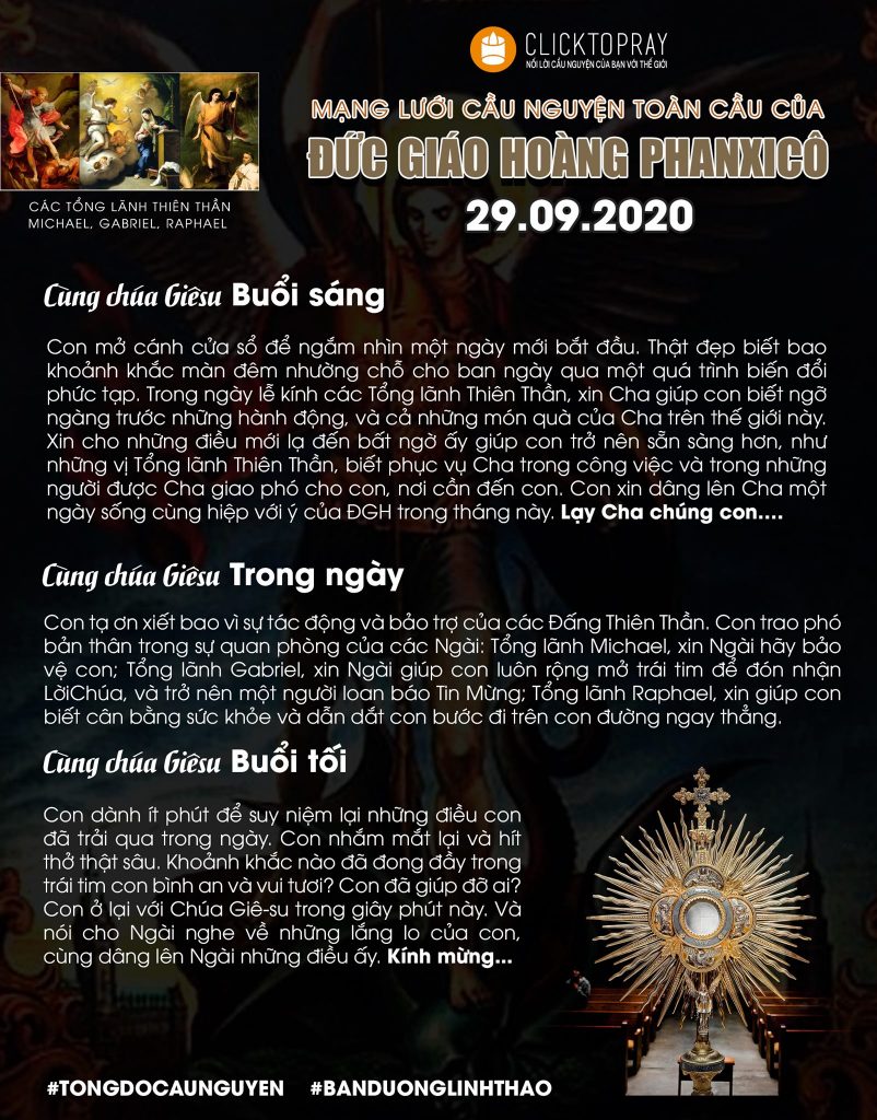 Con mở cánh cửa sổ để ngắm nhìn một ngày mới bắt đầu. Thật đẹp biết bao khoảnh khắc màn đêm nhường chỗ cho ban ngày qua một quá trình biến đổi phức tạp. Trong ngày lễ kính các Tổng lãnh Thiên Thần, xin Cha giúp con biết ngỡ ngàng trước những hành động, và cả những món quà của Cha trên thế giới này. Xin cho những điều mới lạ đến bất ngờ ấy giúp con trở nên sẵn sàng hơn, như những vị Tổng lãnh Thiên Thần, biết phục vụ Cha trong công việc và trong những người được Cha giao phó cho con, nơi cần đến con. Con xin dâng lên Cha một ngày sống cùng hiệp với ý của ĐGH trong tháng này. Lạy Cha chúng con….