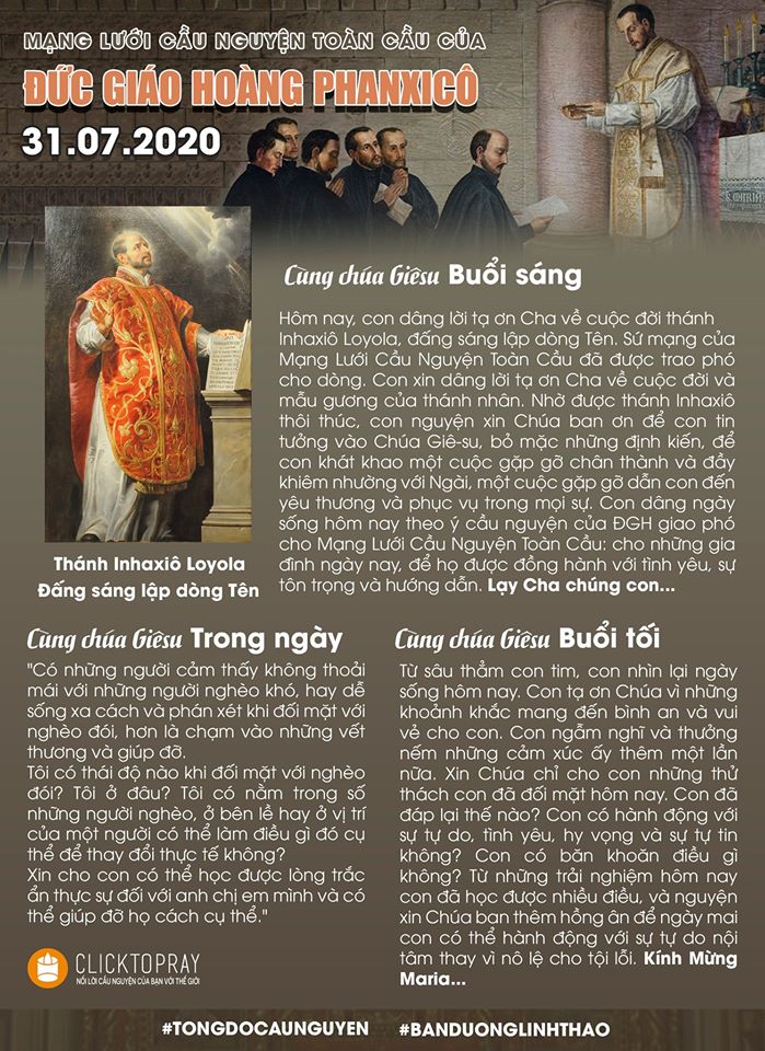 Hôm nay, con dâng lời tạ ơn Cha về cuộc đời thánh Inhaxiô Loyola, đấng sáng lập dòng Tên. Sứ mạng của Mạng Lưới Cầu Nguyện Toàn Cầu đã được trao phó cho dòng. Con xin dâng lời tạ ơn Cha về cuộc đời và mẫu gương của thánh nhân. Nhờ được thánh Inhaxiô thôi thúc, con nguyện xin Chúa ban ơn để con tin tưởng vào Chúa Giê-su, bỏ mặc những định kiến, để con khát khao một cuộc gặp gỡ chân thành và đầy khiêm nhường với Ngài, một cuộc gặp gỡ dẫn con đến yêu thương và phục vụ trong mọi sự. Con dâng ngày sống hôm nay theo ý cầu nguyện của ĐGH giao phó cho Mạng Lưới Cầu Nguyện Toàn Cầu: cho những gia đình ngày nay, để họ được đồng hành với tình yêu, sự tôn trọng và hướng dẫn.