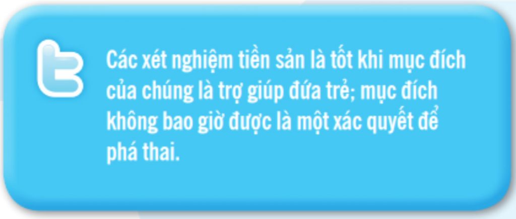 Thật trân trọng khi các xét nghiệm tiền sản có thể đóng góp cho sức khoẻ và hạnh phúc của đứa trẻ chưa sinh hoặc giúp chuẩn bị các thủ tục y tế cần thiết sau hoặc thậm chí trước khi sinh. Nhưng mục đích của các cuộc xét nghiệm như vậy phải luôn luôn là để điều trị cho đứa trẻ.