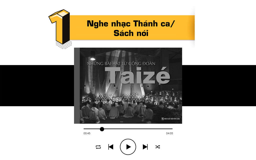 Vậy tại sao bạn không bật những bài Thánh ca bất hủ, những bản nhạc Thánh ca nhẹ nhàng, hay có giai điệu trẻ trung hợp với người trẻ. Ngoài ra, bạn còn có thể nghe sách nói, podcasts, hay radio về những câu chuyện Kinh Thánh.