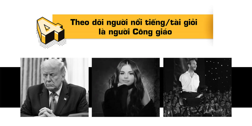 Hẳn là ai cũng có cho mình một thần tượng, có thể là diễn viên, ca sĩ, người mẫu hay thậm chí là một nhà chính trị gia. Và người ta thường học hỏi, bắt chước phong cách sống và cũng có khuynh hướng đi theo tư tưởng của người mình thần tượng. Và mình biết có những người Công giáo tài giỏi, thành công nhưng luôn tin tưởng và giữ mối liên kết chặt chẽ với Chúa. Đây là những người mình thần tượng và luôn theo dõi về đời sống đức tin của họ: