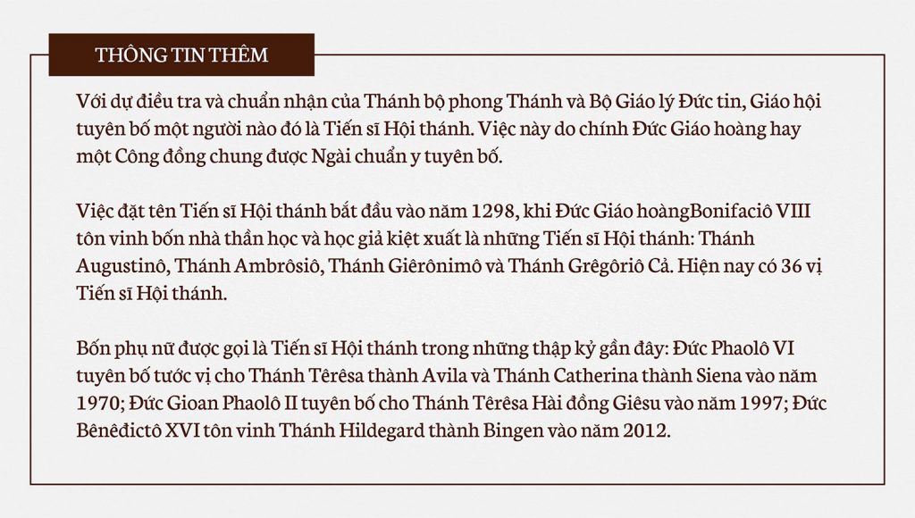 Tiến sĩ Hội thánh là một tước hiệu đặc biệt với Hội thánh Công giáo. Tiêu chuẩn để quyết định cho một người nhận tước vị này là mức độ thánh thiện và sự hiểu biết cao sâu, giáo huấn của họ mang lại lợi ích lớn lao cho đời sống của Giáo hội. Tháng 10 là tháng đặc biệt quan trọng với các chị em dòng Cát Minh (Camelo) bởi hai “Đại Thánh” của họ cùng được kính nhớ: Thánh Têrêsa Lisieux (Têrêsa Hài Đồng Giêsu hoặc Têrêsa Thánh nhan) và Thánh Têrêsa Avila (Têrêsa Giêsu). Cả hai vị đều được tôn phong là Tiến sĩ Hội thánh.