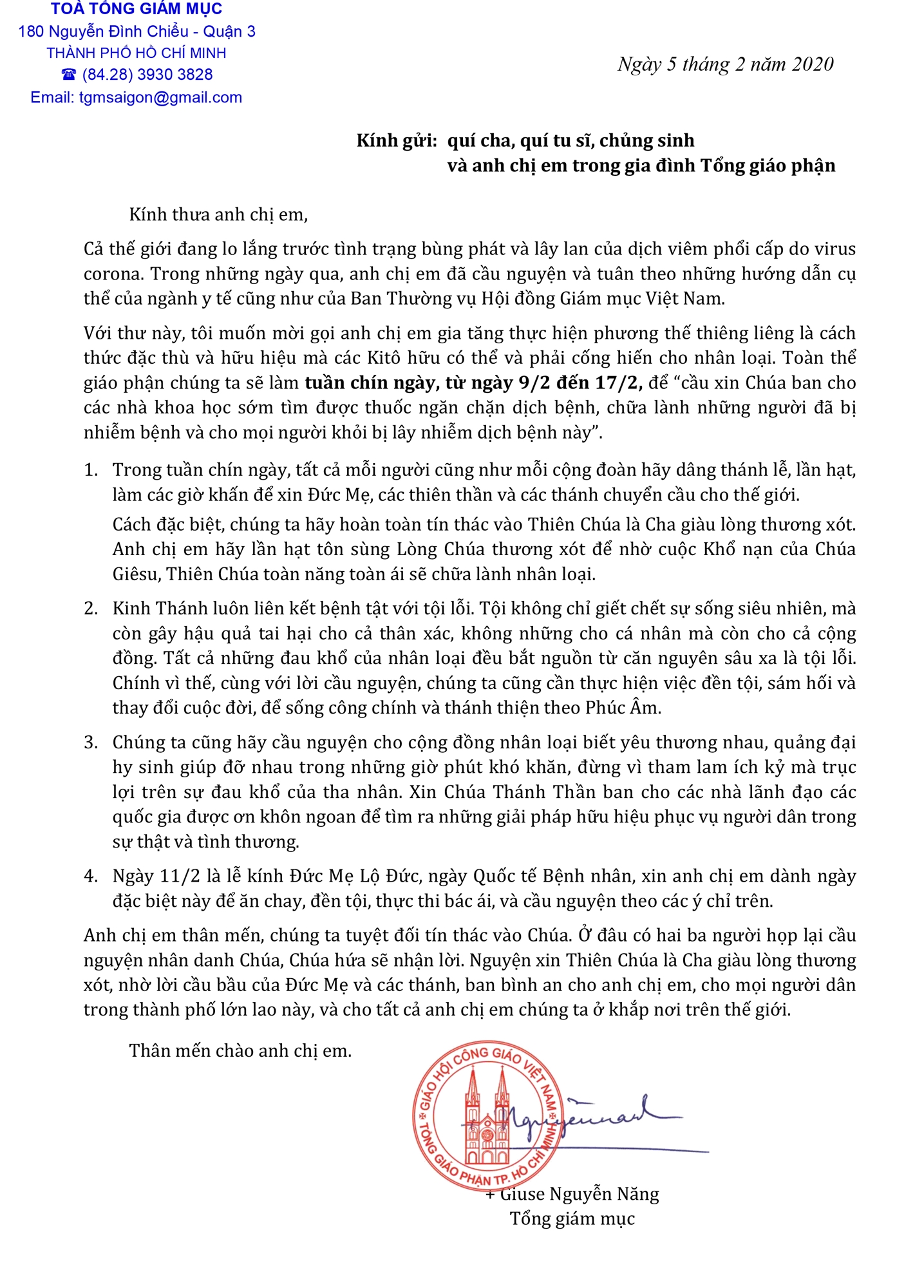 Thư của Đức TGM Giuse Nguyễn Năng về dịch bệnh viêm phổi do virus Corona