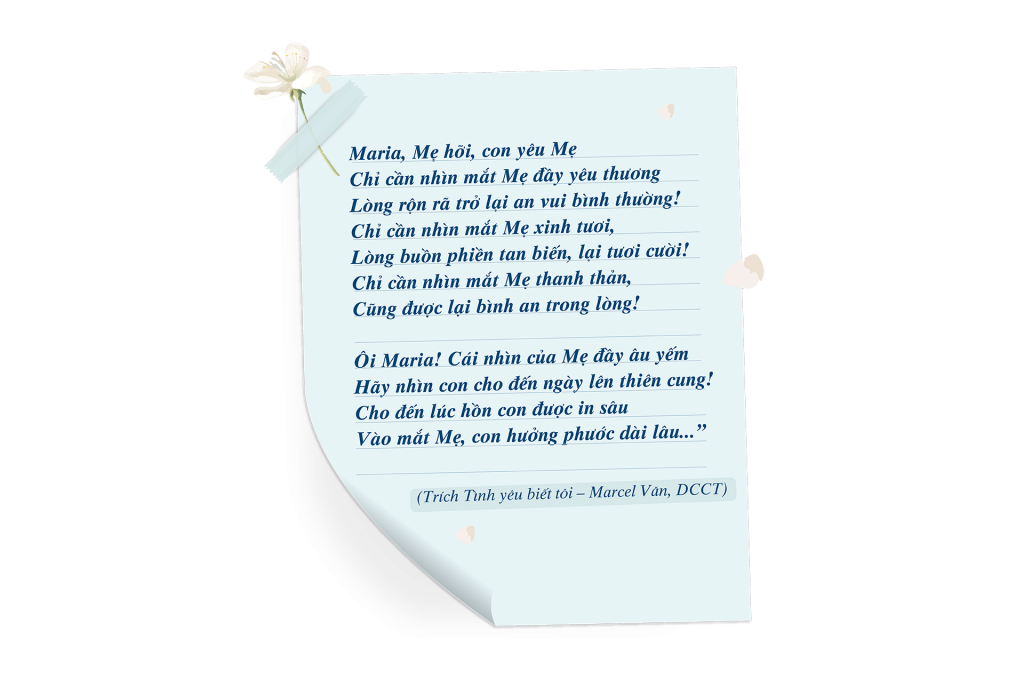 Con xin gửi Mẹ tâm tình đơn sơ như một cánh hoa cỏ dại, giữa muôn vàn đóa hoa rực rỡ của các Thánh đang tô điểm trên nơi Thiên Cung – nơi Mẹ đang hiện diện cùng Thiên Chúa. Con vẫn tin rằng, Mẹ hằng đoái mắt trông nom chúng con, dìu dắt chúng con trên đường về quê trời hưởng phúc bên Mẹ.